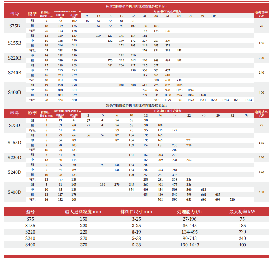 標(biāo)準(zhǔn)型圓錐破碎機(jī)開(kāi)路流程性能參數(shù)表t/h