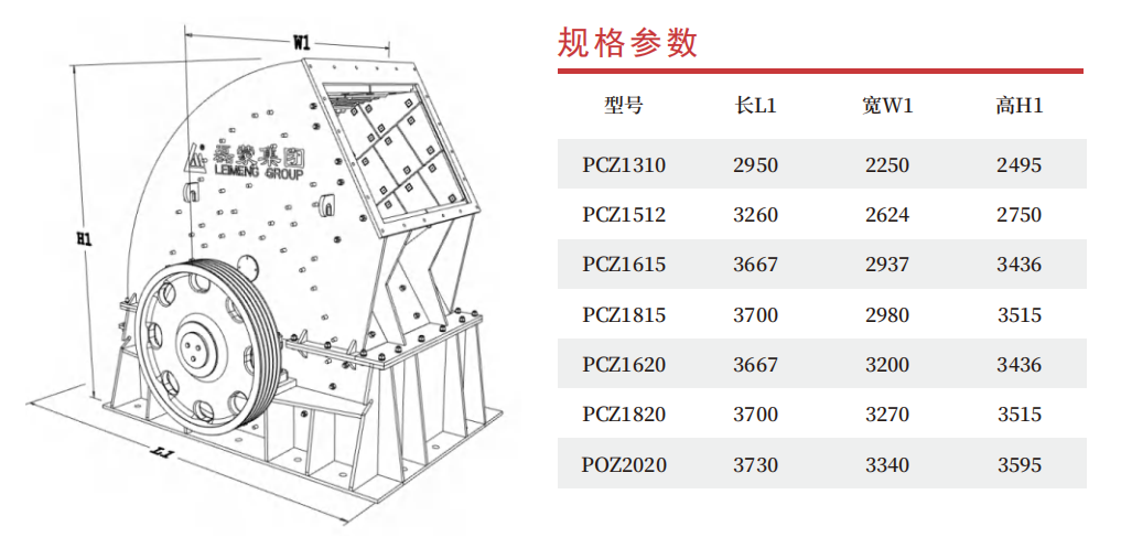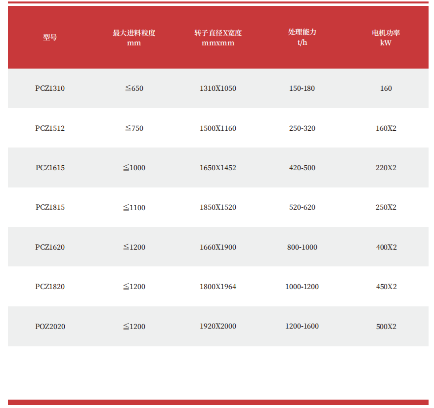 ●pcz系列重型錘式破碎機主要用于抗壓強度不大于200MPa破碎作業(yè),重型錘式破碎機可以將直徑為1000mm的物料直接破碎成20mm左右,具有強大的破碎能力。